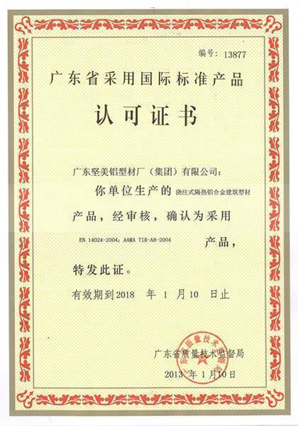 Сертификат, выданный Национальным техническим комитетом стандартизации производства цветных металлов, который свидетельствует о том, что JMA участвовала в составлении национальных стандартов YS/T 769.2-2011 "Технические условия для обеспечения безопасности на производстве труб, стержней и профилей из алюминия и его сплавов, часть 2: анодирование и электрофоретическая окраска", YS/T 769.3-2011 "Технические условия для обеспечения безопасности на производстве труб, стержней и профилей из алюминия и его сплавов, часть 3: электростатическое нанесение покрытий" и YS/T 769.4-2011 "Технические условия для обеспечения безопасности на производстве труб, стержней и профилей из алюминия и его сплавов, часть 4: производство термоизоляционного профиля".